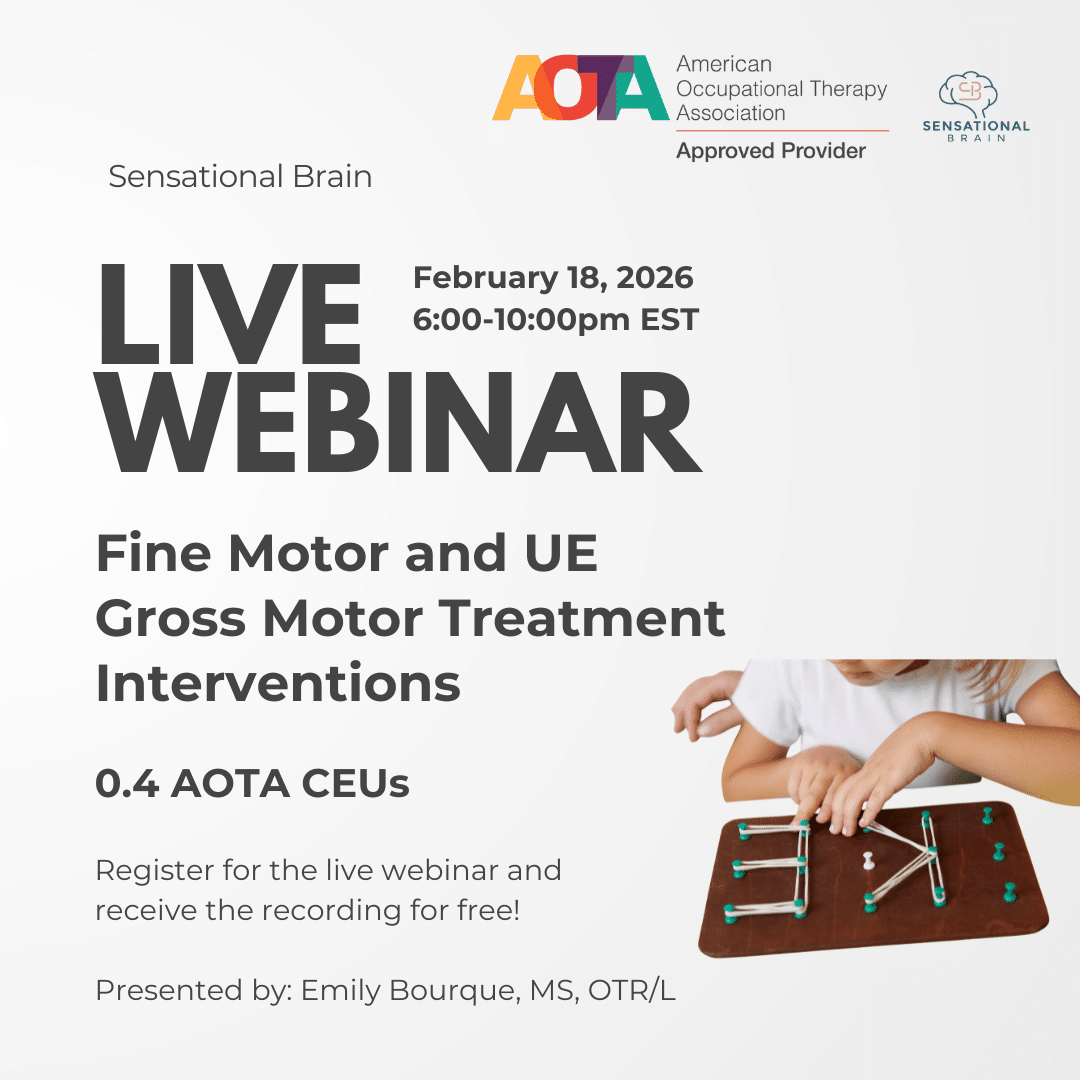 AOTA-Approved Provider Program Sensational Brain LLC is an AOTA Approved Provider of professional development. PD activity ID# 05210. This distance-learning, interactive format is offered at 0.4 CEUs, Introductory Level, OT Service Delivery. The assignment of AOTA CEUs does not imply endorsement of specific content, products, or clinical procedures by AOTA.