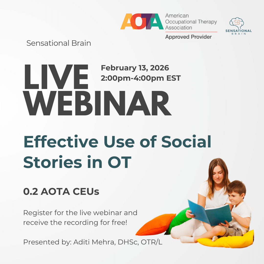 AOTA-Approved Provider Program Sensational Brain LLC is an AOTA Approved Provider of professional development. PD activity ID# 00000. This distance-learning, interactive format is offered at 0.2 CEUs, Introductory level, OT Service Delivery. The assignment of AOTA CEUs does not imply endorsement of specific content, products, or clinical procedures by AOTA or indicate AOTA approval of a certification or other professional recognition.