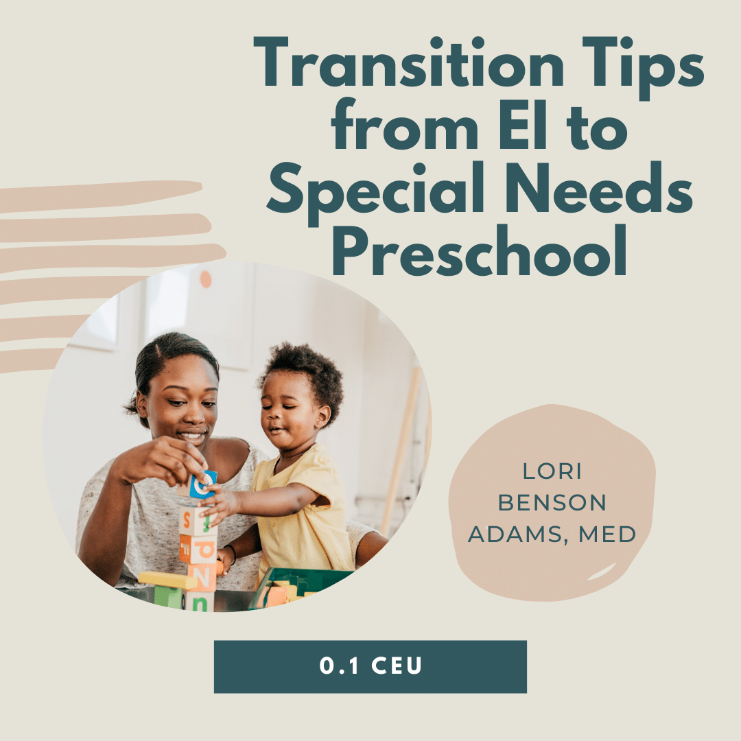 As children participating in Part C/Early Intervention programs approach the age of 2.5 years, the transition process begins, often leading to nervousness and confusion. This clear, approachable, 1-hour course provides therapists with background information on laws, timelines, and procedures regarding the transition process. But, more importantly, it gives many ideas and resources to help guide families and children through this sometimes overwhelming change.